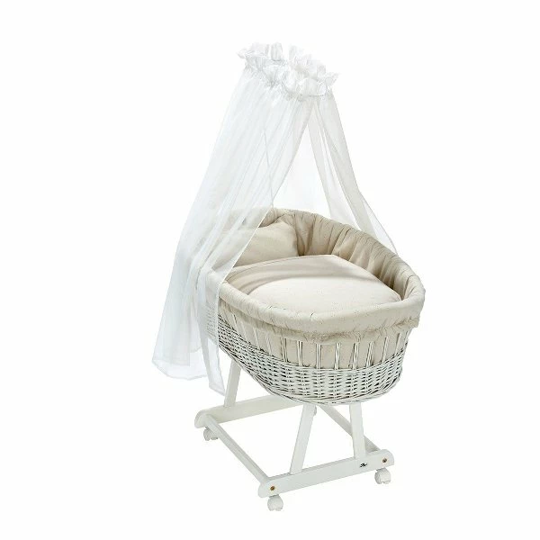 Der Alvi Birthe Stubenwagen bietet noch mehr Komfort fürs Baby: Der extra große Korb aus handgeflochtener Weide sitzt auf einem Untergestell aus vollmassiver Kiefer und ist durch seine vier gebremsten Rollen sicher und flexibel. Der Alvi Birthe Stubenwagen wird mit Himmelstange, Matratze und Garnitur geliefert und bietet einen zauberhaften und kuscheligen Schlafplatz.