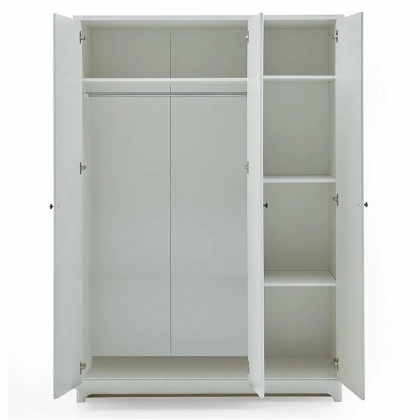 Der Arthur Berndt Thilo Kleiderschrank verfügt über 3 Türen. Links sind 1 Einlegeböden und 1 Kleiderstange vorhanden und rechts befinden sich 3 Einlegeböden. Die Türen sind mit Türdämpfung im Scharnier versehen.