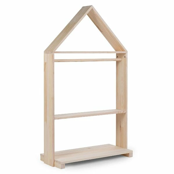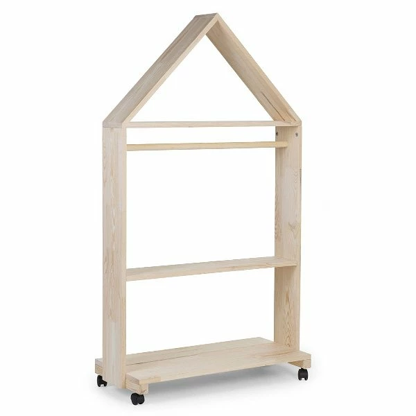 Das Childwood Lagerregal hat die Form eines Hauses und kann auch mit den mitgelieferten Rädern ausgestattet werden. Mit den Rädern lässt sich das Regal leicht bewegen und bietet Ihnen Flexibilität bei der Inneneinrichtung, zwei der Räder sind mit einer Bremse versehen. An der Kleiderstangen lassen sich problemlos einige Kleidungsstücke Ihres Kindes aufhängen und auf den 3 Regalbrettern lassen sich allerhand Sachen aufbewahren.