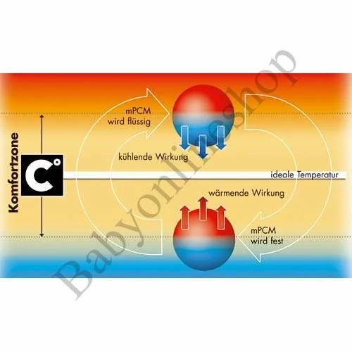 Eingebettete Mikrokapseln reagieren auf Veränderungen von Körper- und Raumtemperatur. Wenn die Temperatur über den Idealwert liegt, werden die im Comfortemp Vlies befindlichen Mikrokapseln flüssig und erzeugen einen Kühleffekt. Sinkt die Temperaturwieder, gehen die Mikrokapseln von der flüssigen in die feste Phase über, setzen dabei Wärmeenergie frei und halten so den Körper auch bei niedrigen Temperaturen angenehm warm.