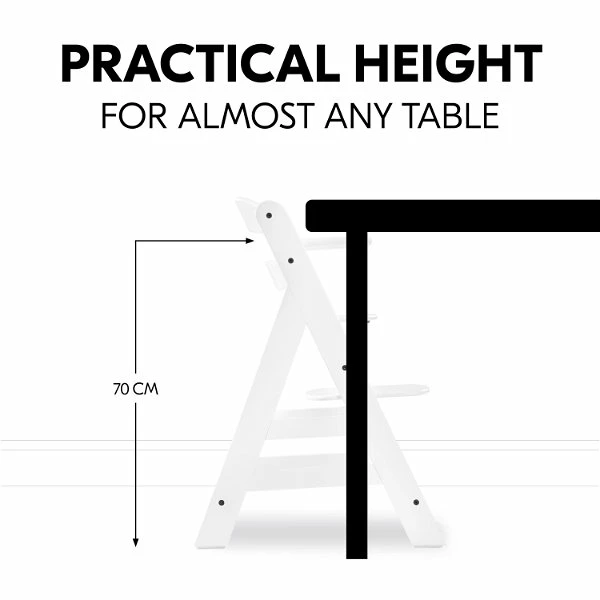 Durch die verstellbare Sitz- und Fußplatte passt sich der Treppenhochstuhl an die Körpergröße deines Kindes an und ermöglicht eine bequeme Sitzposition in jedem Alter. Der Hochstuhl passt auch mit Bügel unter fast jeden Tisch und ist mit einer Maximalbelastung bis 90 kg ein zuverlässiger Begleiter – ein ganzes Leben lang.