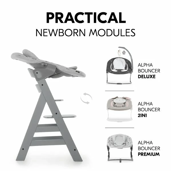 Kombiniert mit den Alpha Bouncer Babyaufsätzen, die auch als Babywippe nutzbar sind, ist dein Baby von Beginn an auf Augenhöhe mit der Familie. Ergänzen kannst du den Alpha+ mit verschiedenen Essbrettern, Hochstuhlauflagen, Sitzverkleinerern, Aufbewahrungsboxen und dem individualisierbaren Spielbrett.