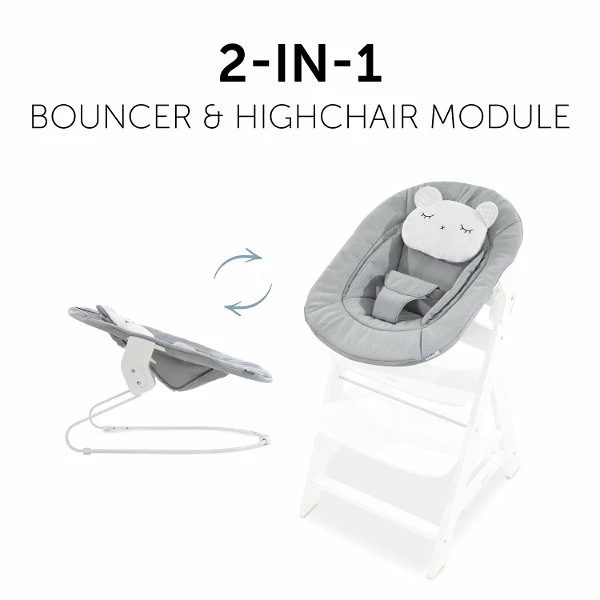 Der 2 in 1 Alpha Bouncer bietet zwei Funktionen: er kann als Wippe auf dem mitgelieferten Wippengestell genutzt werden oder als Neugeborenenaufsatz auf den Alpha+ Holzhochstuhl aufgesteckt werden. So ist dein Baby ab Geburt am Esstisch dabei und kann am Familiengeschehen teilnehmen.