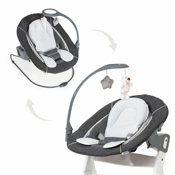 Die Rückenlehne lässt sich per Einhand-Bedienung in Liegeposition verstellen. Ein Mobile sowie die Möglichkeit, den Aufsatz auch als Babywippe zu nutzen, sorgen für entspannte Abwechslung.