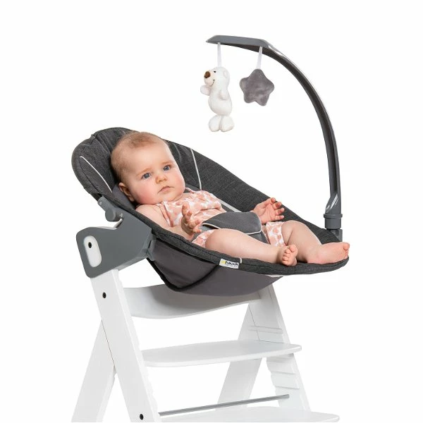 Der ergonomisch geformte und weich gepolsterte Alpha Bouncer Deluxe lässt sich mit nur wenigen Handgriffen direkt auf dem hauck Holzhochstuhl montieren. Der im Lieferumfang enthaltene Sitzverkleinerer stützt das Köpfchen und die zusätzliche seitliche Polsterung sorgt für höchsten Komfort. Die große Liegefläche lässt sich mit nur einer Hand in mehreren Stufen flach stellen. So finden Eltern immer die richtige Position zum Füttern oder Spielen. Durch die erhöhte Position auf dem Kinderstuhl wird beim Füttern der Rücken von Mama und Papa geschont. Die süßen Anhänger am Mobile regen den kleinen Schatz zum Greifen und Drehen an und fördern die motorischen Fähigkeiten. Der Spielebogen kann jederzeit zur Seite gedreht oder abgenommen werden. Der 3-Punkt-Gurt sorgt für die Sicherheit des Kleinen.