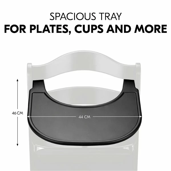 Dank robustem und widerstandsfähigem Material ist das Tablett am Kinderhochstuhl lange nutzbar. Der erhöhte Rand verhindert, dass Spielzeug einfach herunterfällt oder ausgeschüttete Getränke überlaufen. Zum Reinigen wischst du die glatte Oberfläche einfach mit einem Tuch und herkömmlichen Reinigungsmitteln sauber.
