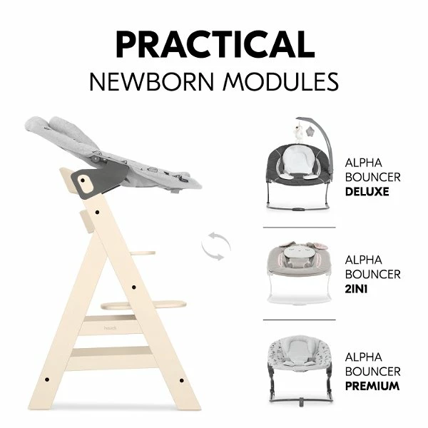 Kombiniert mit den Alpha Bouncer Babyaufsätzen, die auch als Babywippe nutzbar sind, ist dein Baby von Beginn an auf Augenhöhe mit der Familie. Ergänzen kannst du den Alpha+ mit verschiedenen Essbrettern, Hochstuhlauflagen, Sitzverkleinerern, Aufbewahrungsboxen und dem individualisierbaren Spielbrett.