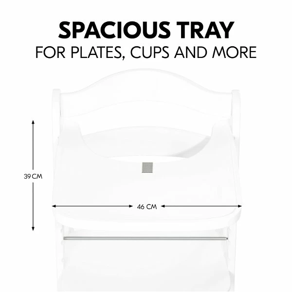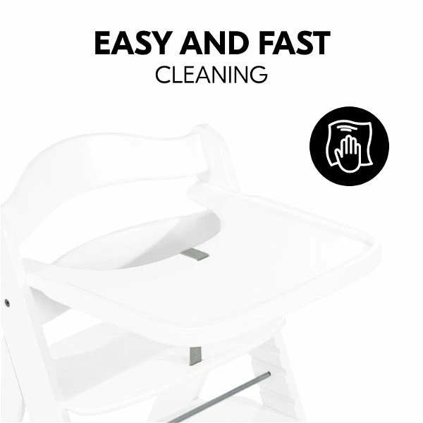 Dank robustem und widerstandsfähigem Material ist das Tablett am Kinderhochstuhl lange nutzbar. Der erhöhte Rand verhindert, dass Spielzeug einfach herunterfällt oder ausgeschüttete Getränke überlaufen. Zum Reinigen wischst du die glatte Oberfläche einfach mit einem Tuch und herkömmlichen Reinigungsmitteln sauber.