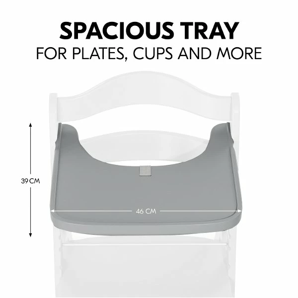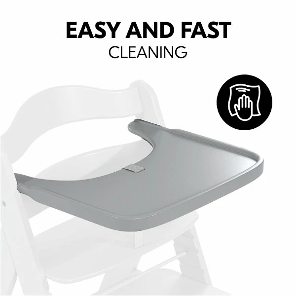 Dank robustem und widerstandsfähigem Material ist das Tablett am Kinderhochstuhl lange nutzbar. Der erhöhte Rand verhindert, dass Spielzeug einfach herunterfällt oder ausgeschüttete Getränke überlaufen. Zum Reinigen wischst du die glatte Oberfläche einfach mit einem Tuch und herkömmlichen Reinigungsmitteln sauber.