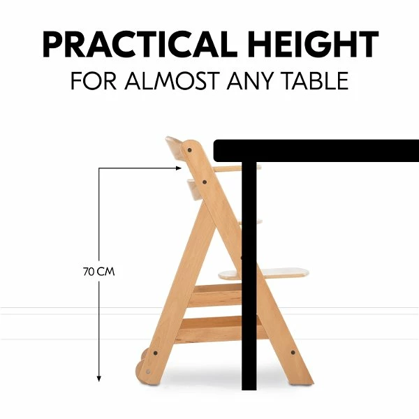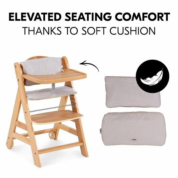 Für Sicherheit sorgen der 5-Punkt-Gurt und der Schrittgurt, welche mit dem anderen Zubehör kompatibel sind. Auf dem großzügigen Holztisch hat dein Kind individuellen Freiraum zum Essen und Spielen. Alternativ kannst du den Tisch gegen den Vorderbügel austauschen und den Stuhl unter fast jeden Tisch schieben. Die im Set enthaltene Hochstuhlauflage besteht aus einem weichen Kissen für Rückenlehne und Sitz, welche deinem Kind erhöhten Sitzkomfort beim Essen und Spielen bieten.