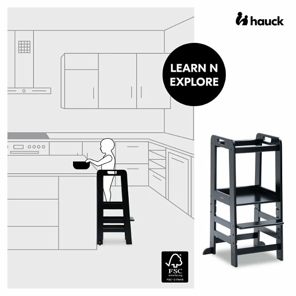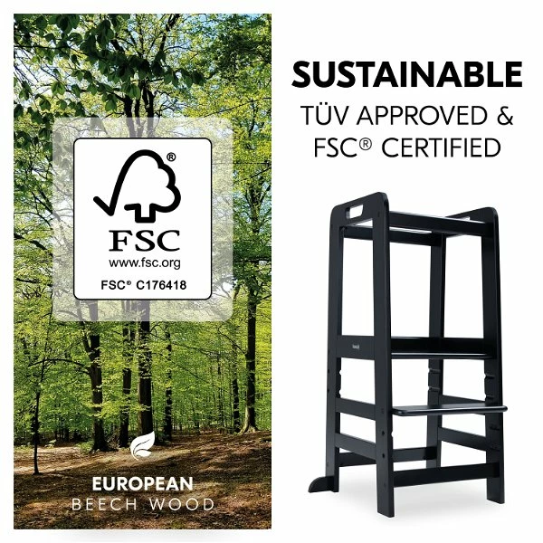 Dank der erhöhten Position des Mehrzweck-Lernturms kann dein Kind, sobald es selbstständig steht, unterschiedliche Tätigkeiten auf Augenhöhe zusammen mit der Familie machen. Das stärkt euer Zusammengehörigkeitsgefühl. Nach dem Montessori Prinzip „Hilf mir es selbst zu tun“ übernimmt dein Kind von klein auf spielerisch, z.B. beim Kochen oder Backen mit dem Küchen-Lernturm, selbst Aufgaben. Das stärkt die Selbstständigkeit, die sprachliche und soziale Entwicklung und das Selbstvertrauen. Der Stehturm ist FSC®-zertifiziert, das heißt das Buchenholz stammt aus FSC®-zertifizierten Wäldern mit nachhaltiger Waldwirtschaft.