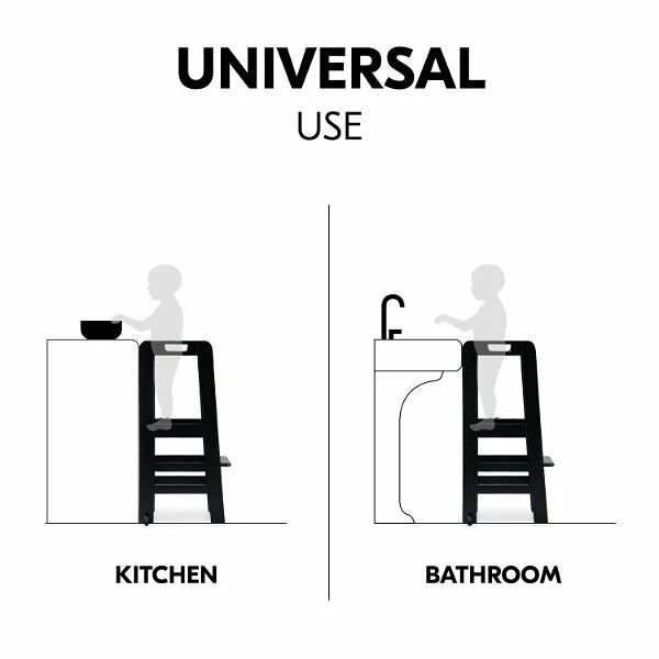 Je nach Größe deines Kindes kannst du das Standbrett in eine der 3 verschiedenen Höhen-Stufen einstellen. Der Lernturm ist dank seiner stabilen Konstruktion robust und bis 40 kg belastbar. Du kannst den Lernturm in der Küche, im Bad am Waschbecken oder auch an einem Tisch verwenden. Auf diese Weise erreicht dein Kind viele Dinge leicht und selbstständig.