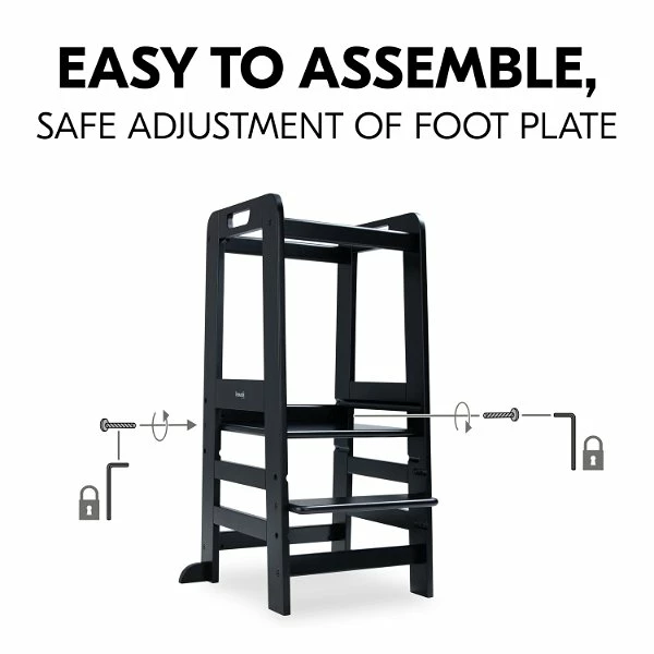 Schrauben und Werkzeug werden mitgeliefert. So verstellst du das Standbrett bei Bedarf jederzeit ganz einfach mit nur zwei Schrauben. Die Form und das Design des Lernturms sind an den Look der hauck Holzhochstühle angepasst, in vielen Farben erhältlich und ergeben ein stimmiges Bild in deiner Einrichtung.