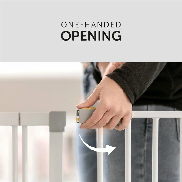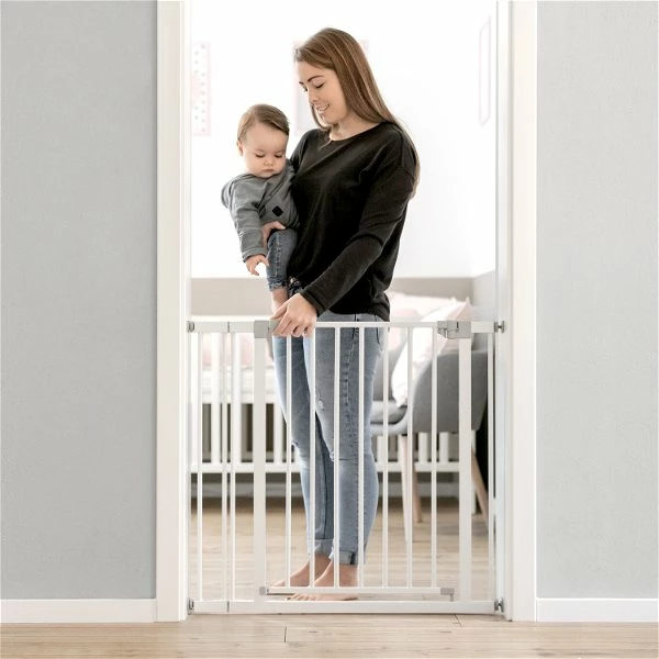 Das Kindergitter lässt sich mittels Stellschrauben sicher zwischen Treppenaufgängen, Wänden oder Türrahmen einspannen. Es muss nicht gebohrt werden. Zum Hindurchgehen können Erwachsene die 50 cm breite Tür mit nur einer Hand in beide Richtungen öffnen. Dadurch ist die andere Hand für den kleinen Schatz oder Einkaufstaschen frei. Das Stop N Safe 2 hat einen manuellen Schließmechanismus mit einer Zweifach-Sicherung, wodurch ein unkontrolliertes Öffnen durch Kinder verhindert wird.