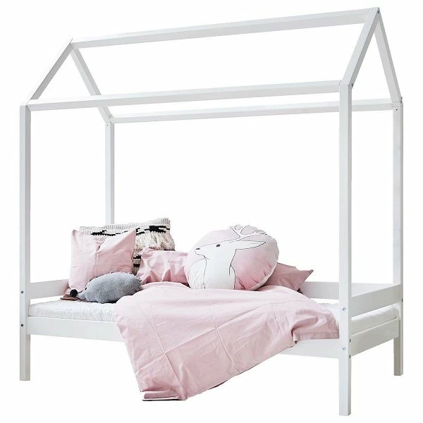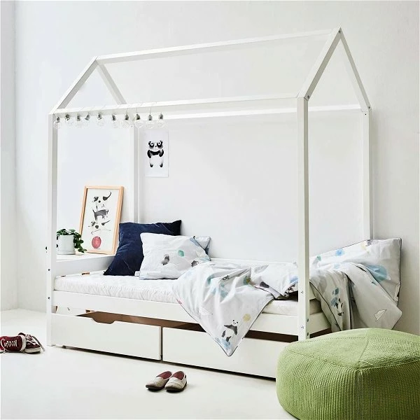 Erstellen Sie mit dem Hoppekids ECO Comfort Hausbett einen geschützten Raum im Raum als Übergang vom Babybett zum Erwachsenenbett, in dem sich die Kinder geborgen fühlen und der zum Spielen einlädt.