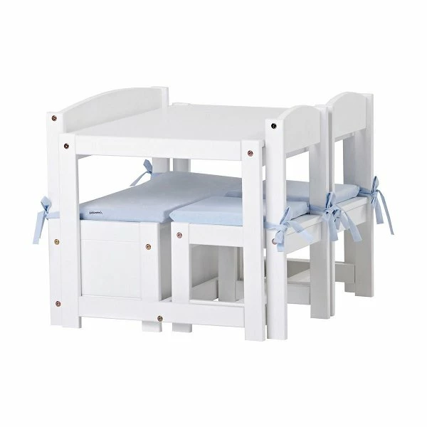 Mit der Hoppekids Kindersitzgruppe Mathilde können die Teepartys etwas größer ausfallen, hier finden schon 4 Kinder einen Platz am Tisch. Hier kann gemeinsam gebastelt, gemalt und gepuzzelt werden – und wenn Aufräumen angesagt ist, dann wandern alle Mal- und Bastelutensilien unter die Klappe der Sitzbank und die Stühle werden unter den Tisch geschoben. So schnell war noch nie aufgeräumt!