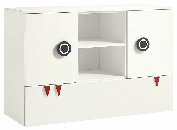 Die hülsta now! minimo Kommode ist mit 2 Türen, je 1 Einlegeboden, 1 Schublade und 2 offenen Fächern ausgestattet und bietet somit viel Platz für Windeln und Pflegemittel.