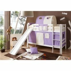 Ticaa Lupo Etagenbett Mit Rutsche Buche Weiß Massivholz – Vorhang-Dessin Wählbar