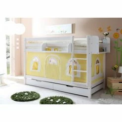 Ticaa Marcel Etagenbett Kiefer Weiß Massivholz – Vorhang-Dessin Wählbar