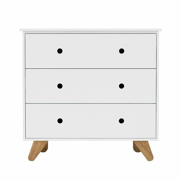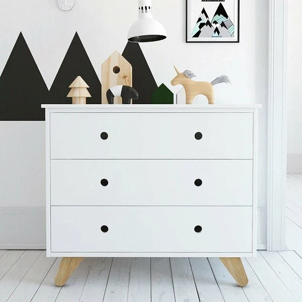 Die Nature Kid Ancona Kommode passt optimal zum Wigwambett Ancona. Das strahlende weiß mit den naturfarbenen Füßen aus massiver Kiefer macht die Kommode elegant und zeitlos. Die drei großen Schubladen bieten enorm viel Platz, sie laufen leichtgängig auf Metallschienen.