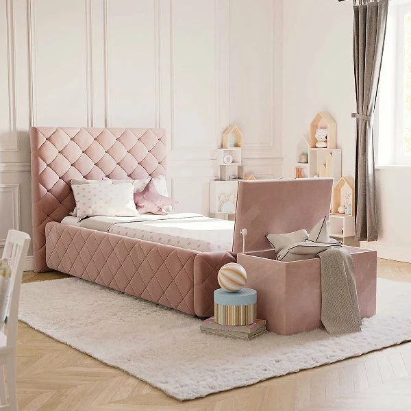 ArtKid Viana Polsterbett – 90 x 200 cm Velour rosa mit Bettkasten und Spielzeugkiste