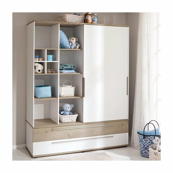 Der Paidi Carlo Schiebetürenschrank ist mit 2 Schiebetüren, 2 Schubkästen und 2 Mittelwänden ausgestattet. Links befinden sich 2×3 Einlegeböden, rechts ein Einlegeboden und 2 Kleiderstangen. Die großen Schubkästen bieten viel Stauraum und und haben jeweils eine Front in Fichte-Vintage-Nachbildung und in kreideweiß.