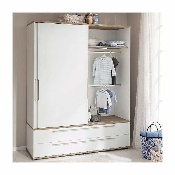 Der Paidi Carlo Schiebetürenschrank ist mit 2 Schiebetüren, 2 Schubkästen und 2 Mittelwänden ausgestattet. Links befinden sich 2×3 Einlegeböden, rechts ein Einlegeboden und 2 Kleiderstangen. Die großen Schubkästen bieten viel Stauraum und und haben Fronten in kreideweiß.