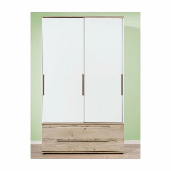 Der Paidi Carlo Kleiderschrank in kreideweiß und warmer Fichte-Vintage-Nachbildung trifft den modernen Zeitgeist. Die innovativen Schiebetüren des Kleiderschranks fahren komplett hintereinander durch, wodurch jeder Winkel des Schranks erreicht werden kann. Durch den Einsatz der Schiebetüren kann ein individueller Look erzeugt werden.