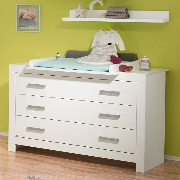 Die alternativ zur Auswahl stehende Wickelkommode ist mit 3 breiten Schubkästen mit Facheinteilung ausgestattet. Der obere Schubkasten besitzt auch bei dieser Kommode einen Vollauszug.