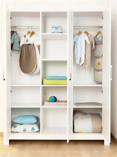 Der Paidi Fiona Kleiderschrank ist mit modernen Fronten in Kassettenoptik gestaltet. Matte Chrom-Griffe unterstreichen den schlichten, edlen Look. Der Innenraum ist durch zwei Mittelwände unterteilt. Rechts und links befinden sich jeweils 2 Einlegeböden und 1 Kleiderstange. In der Mitte befinden sich 4 Einlegeböden.