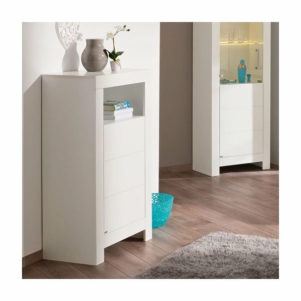 Das Regal hat 1 offenes Fach und 1 Einlegeboden hinter der Tür. Es kann mit dem Highboard aus dieser Serie kombiniert werden, da beide Möbel die gleiche Höhe haben.