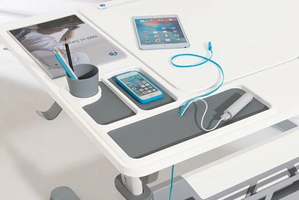 - L-förmiges, feststehendes Plattenelement mit dreigeteilter Ablageschale inkl. Anti-Rutsch-Einlagen, mit Kabeldurchlass und Stiftebecher