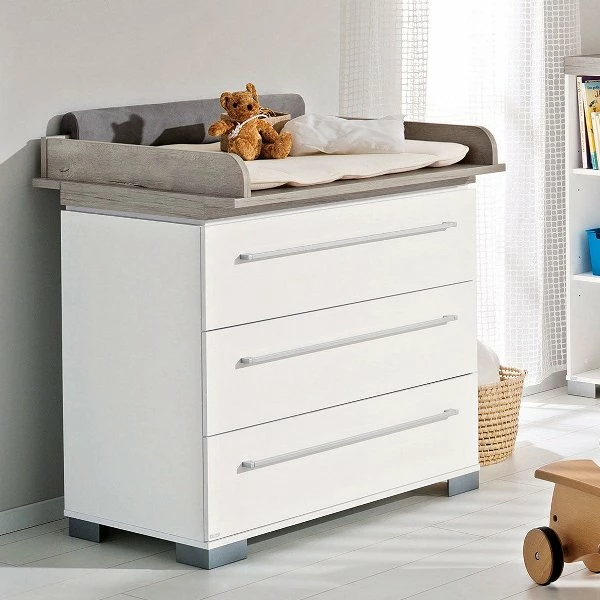 Der im Lieferumfang enthaltene Wickelaufsatz ist durch die bereits vorgegebenen Bohrungen schnell und einfach zu montieren. Dank des abnehmbaren Wickelansatzes wird Ihnen die Kommode auch lange Zeit nach dem Wickeln noch Freude bereiten.