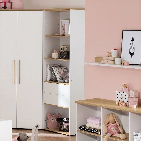 Das Paidi Oscar Anstell-Regal kann einzeln aufgestellt werden oder an die schmale oder breite Seite des Oscar Eck-Kleiderschrankes angestellt werden. Die Deck- und Bodenplatte sowie die Regalböden bestehen aus Eiche-Nebraska-Nachbildung und der Korpus ist kreideweiß.