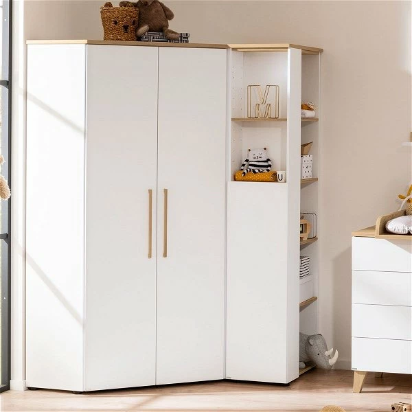 Das Paidi Oscar Eck-Regal kann einzeln aufgestellt werden oder an die schmale oder breite Seite des Oscar Eck-Kleiderschrankes angestellt werden. Der Aufbau ist spiegelverkehrt möglich. Die Deck- und Bodenplatte sowie die Regalböden bestehen aus Eiche-Nebraska-Nachbildung und der Korpus ist kreideweiß.