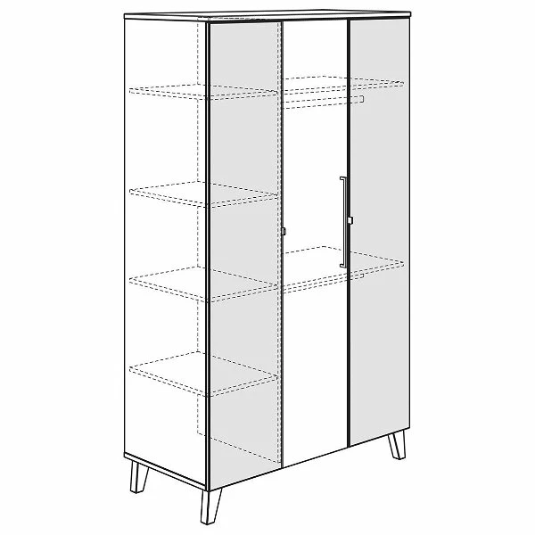 Der Kleiderschrank ist mit 3 Türen ausgestattet. Die linke und die rechte Außentüren sind als Spiegeltüren ausgeführt. Der Innenraum ist durch eine Mittelwand unterteilt. Rechts befinden sich 2 breite Einlegeböden und 2 breite Kleiderstangen, Links befinden sich 4 Einlegeböden.