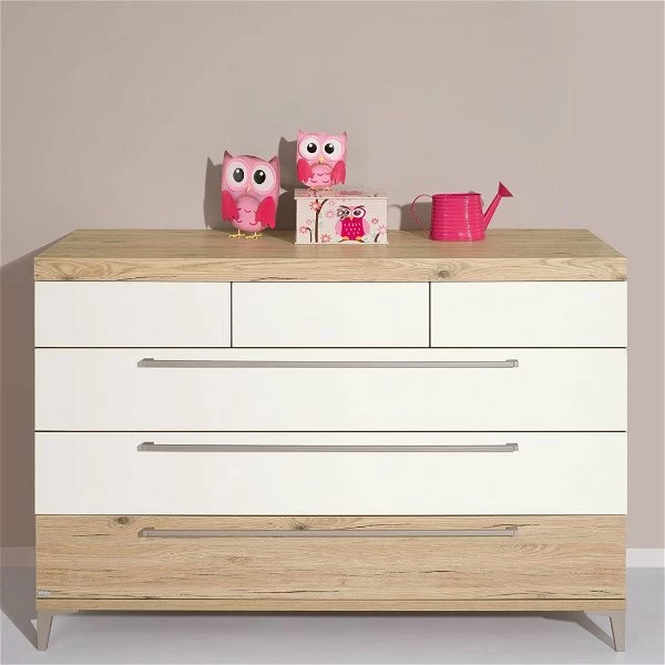 Die Paidi Remo Wickelkommode kombiniert trendiges Kreideweiß mit einem warmen Eiche-Bordeaux-Dekor und schafft in jedem Kinderzimmer eine gemütliche Atmosphäre. Die breiten Griffe und formschönen Füße in einem farblich harmonierenden Nickelton unterstreichen die moderne und dennoch zeitlose Optik