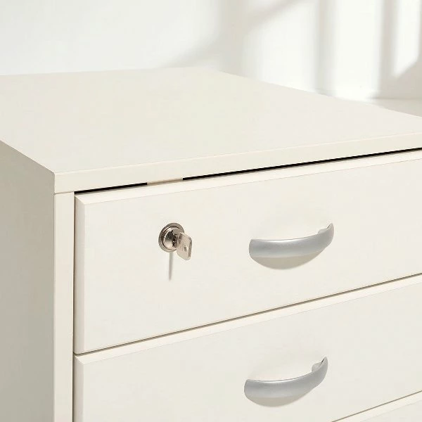 Der Rollcontainer ist ein praktischer Begleiter unter oder neben dem Schreibtisch. In seinen drei Schubkästen finden Stifte, Hefte & Co. ihren Platz und im oberen Schubkasten ist sogar eine Utensilienschale integriert, die Kleinkram ordentlich aufbewahrt. Zusätzlich ist der obere Schubkasten abschließbar. Auf der Rückseite des Rollcontainers ist eine Ablage für Zeitschriften o.ä. angebracht.