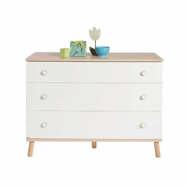 Die Paidi Ylvie Kommode ist mit 3 breiten, geräumigen Schubkästen ausgestattet. Der obere Schubkasten besitzt einen Vollauszug, damit der gesamte Inhalt überblickt werden kann. Er besitzt immer eine kreideweiße Front. Die übrigen Fronten können gewählt werden. Die Deckplatte, die Griffe und die Füße der Kommode sind aus Birke-Massivholz gefertigt.