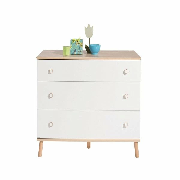 Die Paidi Ylvie Kommode ist mit 3 geräumigen Schubkästen ausgestattet. Der obere Schubkasten besitzt einen Vollauszug, damit der gesamte Inhalt überblickt werden kann. Er besitzt immer eine kreideweiße Front. Die übrigen Fronten können gewählt werden. Die Deckplatte, die Griffe und die Füße der Kommode sind aus Birke-Massivholz gefertigt.