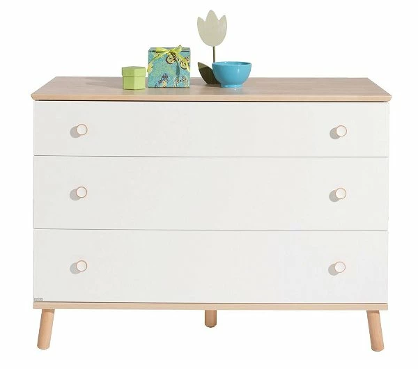 Die Paidi Kommode breit ist mit 3 breiten Schubkästen ausgestattet. Die Schubkästen können wahlweise in kreideweiß oder Birke-Nachbildung geliefert werden. Der obere Schubkasten ist auch hier immer kreideweiß und hat einen Vollauszug. Die breiten Schubkästen besitzen bereits eine Facheinteilung.