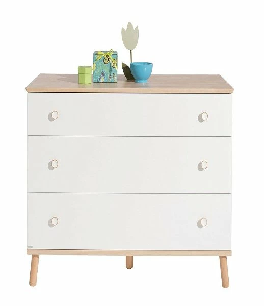 Die Paidi Kommode schmal ist mit 3 Schubkästen ausgestattet. Die Schubkästen können wahlweise in kreideweiß oder Birke-Nachbildung geliefert werden. Der obere Schubkasten ist immer kreideweiß und hat einen Vollauszug. Der im Preis enthaltene Wickelaufsatz bietet eine Wickelfläche von 84,2 x 76,8 cm. In die Schubkästen kann ein Schubkasten-Einsatz eingesetzt werden, dieser wird weiter unten als Variante angeboten.