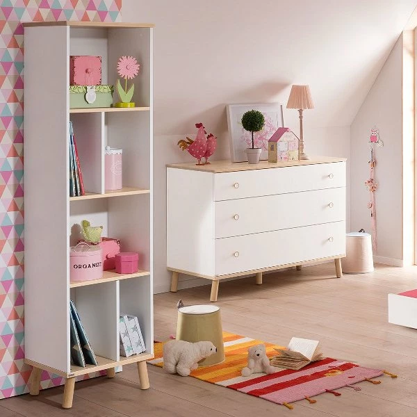 Das Paidi Regal hat 3 Fachböden in Birke-Nachbildung, 2 Fächer sind zusätzlich asymmetrisch geteilt. Die Deckplatte und der Sockel mit den Füßen sind aus massiver Birke gefertigt. Das Regal aus der Serie „Ylvie“ von Paidi macht nicht nur im Kinderzimmer eine gute Figur.