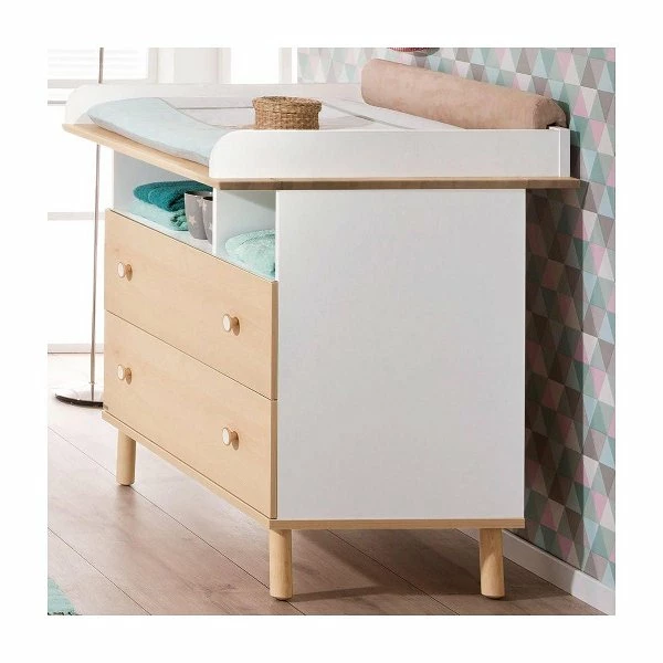 Die Wickelkommode ist mit 2 geräumigen Schubkästen und einem offenen Fach ausgestattet. Die Schubkästen haben Fronten in Birke-Nachbildung. Die Deckplatte, die Griffe und die Füße sind aus Massivholz gefertigt.