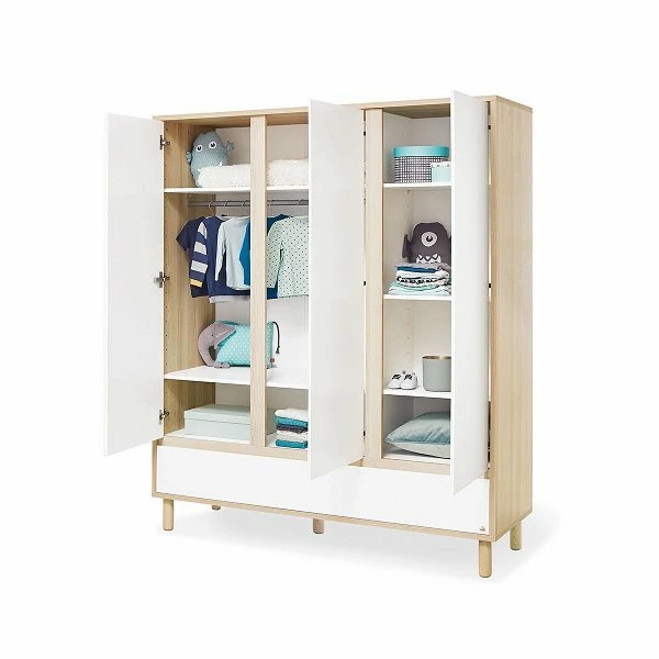 Der Pinolino Flow Kleiderschrank zaubert eine helle und einladende Atmosphäre ins Kinderzimmer. Die Kombination aus Esche Dekor mit Echtholzstruktur und klassischem Weiß sorgt in Kombination mit den angeschrägten Griffmulden für eine zeitlose Gemütlichkeit.