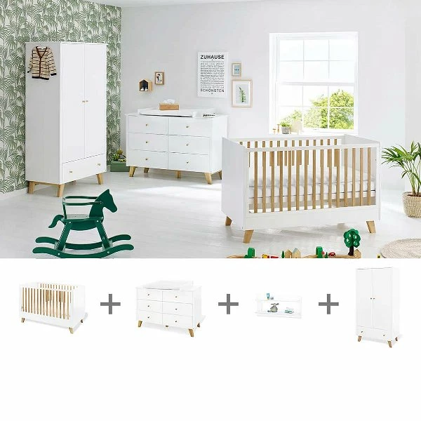 Mit weißen Fronten und Möbelfüßen aus massiver Eiche versprüht das Pinolino Pan Kinderzimmer seinen Retro-Charme im Reich Ihrer Kleinen. Ein trendiges Design für moderne Familien.