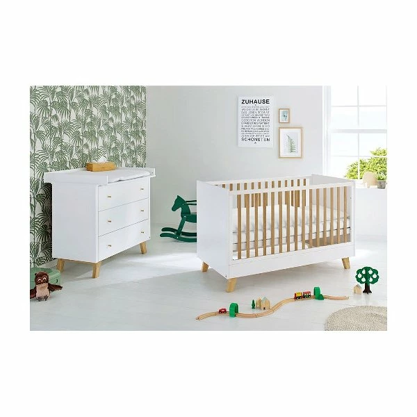 Mit weißen Fronten und Möbelfüßen aus massiver Eiche versprüht das Pinolino Pan Sparset breit seinen Retro-Charme im Reich Ihrer Kleinen. Ein trendiges Design für moderne Familien.