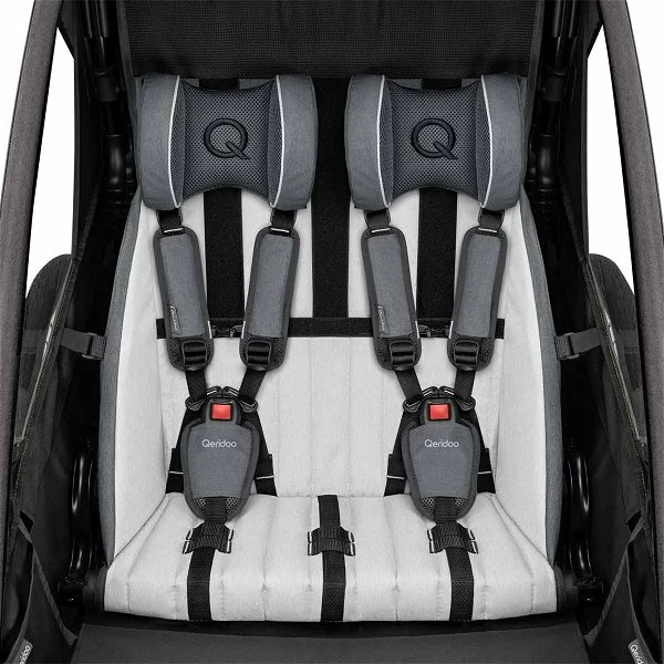 Der Qeridoo Sportrex 2 bietet Ihnen einen stabilen Aluminiumrahmen, der Ihre Kinder rundum schützt. Die Kopfprotektoren verhindern Verletzungen beim Umkippen. Radabweiser, 5-Punkt-Gurt und genügend Kopffreiheit sorgen für zusätzliche Sicherheit bei jedem Ausflug. Wussten Sie, dass der Schiebegriff im Trailer-Modus als Überrollbügel fungiert? Oder dass das Blattfeder-Dämpf-System die Wirbelsäule Ihrer Kinder vor Stößen bewahrt? Das und vieles mehr bietet Ihnen der Qeridoo Sportrex 2.