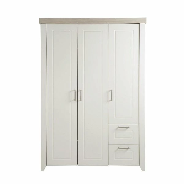 Der Kleiderschrank Felicia ist mit 3 Türen und 2 Schubladen ausgestattet. Innen befindet sich 5 Einlegeböden und 1 Kleiderstange.