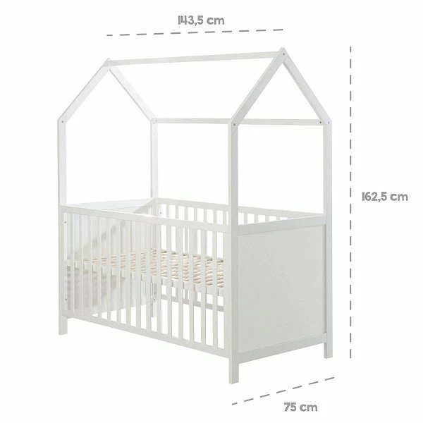 Das Roba Hausbett hat eine Liegefläche von 70×140 cm und ist mehrfach höhenverstellbar. Dank der 3 Schlupfsprossen wird das Ein- & Aussteigen für Ihr Kind erleichtert. Später lässt es sich mit ein paar Handgriffen in ein Juniorbett und anschließen in ein Kuschelsofa umbauen.